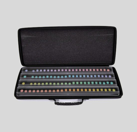 The kit consists of four trays with a total of 85 removable color reference caps spanning the visible hue spectrum. Test subjects arrange the caps in order of hue to evaluate color vision aptitude. The package includes scoring software to analyze and interpret results quickly and efficiently.