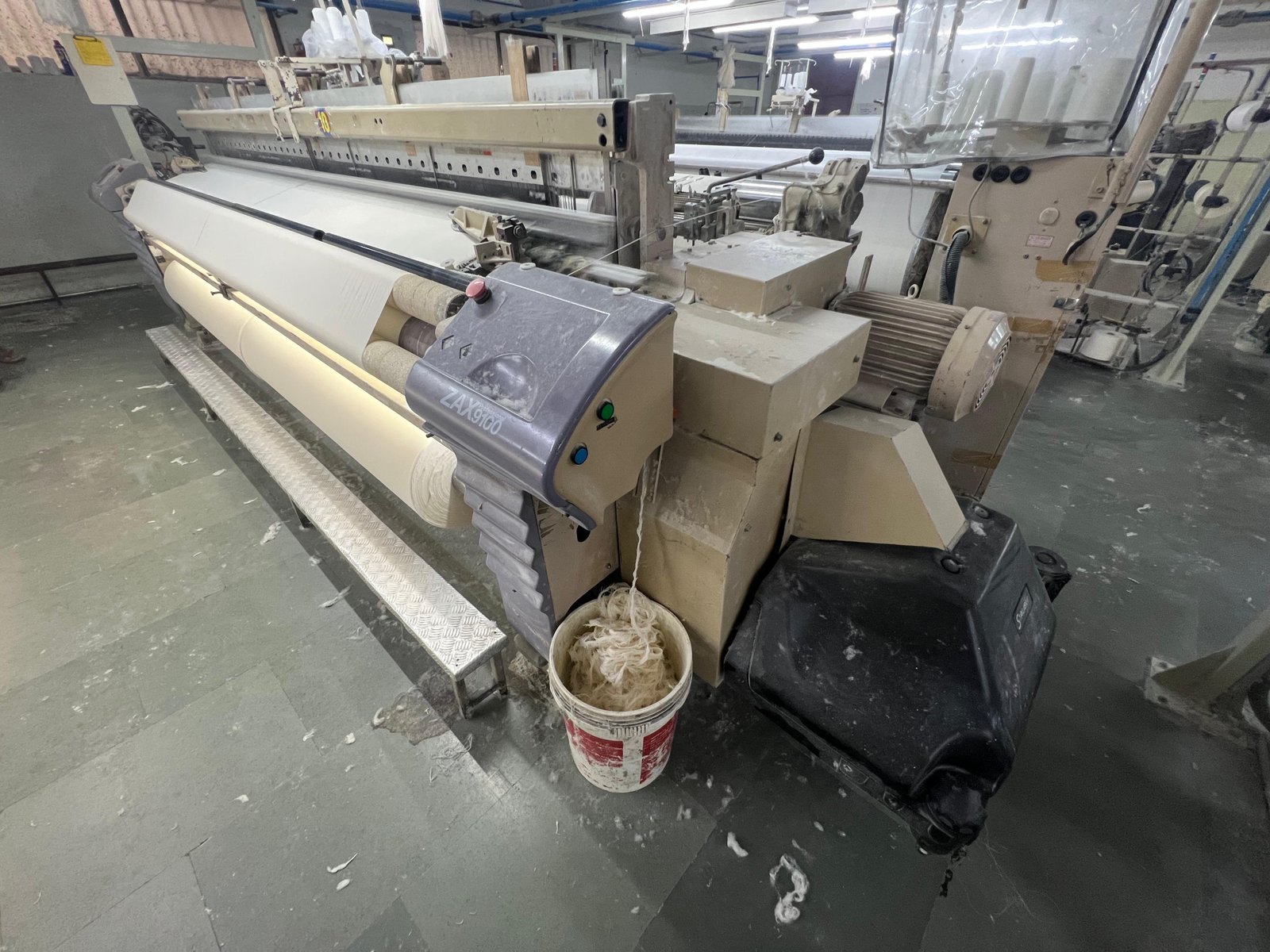 Buy Tsudakoma 9100 Airjet Looms (340 cm, 2007 Make) equipped with Staubli 2881 Dobby (16 Lever) and Staubli Cam (6 Lever). Includes frames, feeders, beam, cloth roll, healds, and droppers. Excellent working condition. Ready for inspection and export.